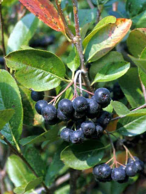 Aronia melanocarpa, commonly called black chokeberry, is an open, upright, spreading, somewhat rounded but leggy, suckering, deciduous shrub that typically grows 3-6’ tall. It is native to low woods, swamps, bogs and moist thickets but occasionally to dry upland areas, from Newfoundland to southern Ontario and Minnesota south to Missouri, Tennessee and Georgia. It is noted for its 5-6 flowered clusters of white 5-petaled spring (May) flowers, glossy elliptic to obovate dark green leaves (to 2-3” long) with finely . The common name of chokeberry is in reference to the tart and bitter taste of the fruits which are edible but so astringent as to cause choking in most of those who try. Fruits are sometimes used to make tasty jams and jellies.