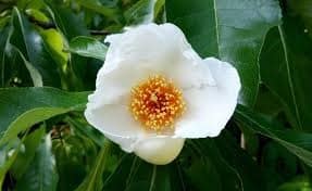 Small native (extinct in the wild) understory tree named after Ben Franklin. Fragrant white flowers and red fall color. 10 – 20’ ht. It is prized for its fragrant white flowers, similar to single white Camellia blossoms; the smell may remind some of orange blossoms or honeysuckle. The tree has a symmetrical, somewhat pyramidal shape, often with different individuals of the species forming almost identical crowns. It frequently suckers and can form several vertical trunks close to ground level. The bark is gray with vertical white striations and has a ridged texture. The alternate, obovate leaves are up to 6 in (15 cm) in length and turn a bright orange-red in the fall. Once established, F. alatamaha can live a century or more.