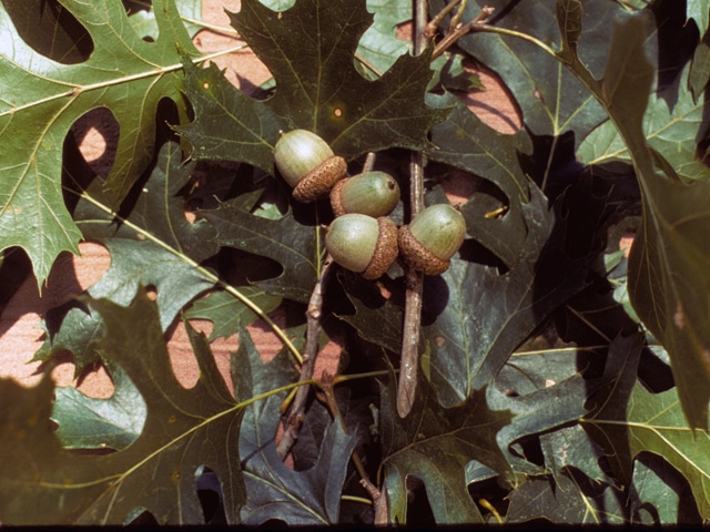 Shumards oak is a pyramidal tree, growing 50-90 ft. and becoming more open at maturity. Bark is thick, smooth and grayish, becoming furrowed and darker gray. The columnar trunk is frequently buttressed at the base. Lower branches are chiefly horizontal. Leaves frequently turning scarlet in the fall, up to 7 inches long, with 2 to 4 pairs of pointed lobes with soft, bristlelike tips. Sinuses between the lobes reaching from 1/2 to 3/4 the distance from the tip of the lobe to the leaf midrib. Acorns almost as wide as long, 3/4 to 1 inch long when mature with a broadly rounded apex and a flat base.